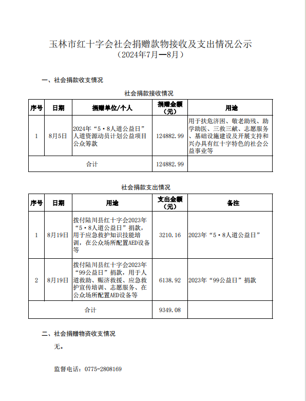 玉林市红十字会社会捐赠款物接收及支出情况公示(2024年7月—8月)