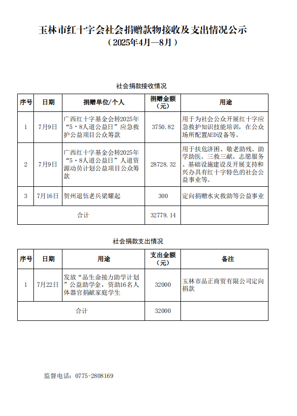 玉林市红十字会社会捐赠款物接收及支出情况公示(2025年4月—8月)